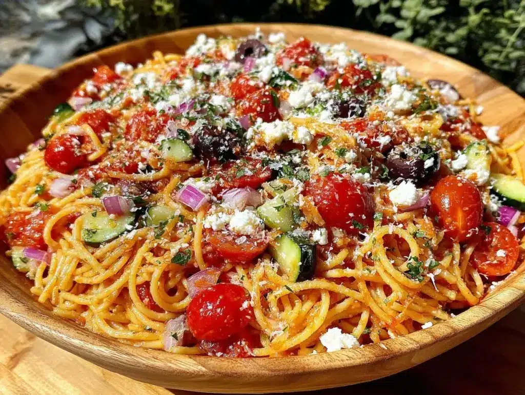 If you want to keep things lighter, swap the pasta for whole wheat or gluten-free spaghetti. For a dairy-free version, skip the feta or substitute with a plant-based cheese. In summer, swapping out cucumbers for zucchini ribbons or adding fresh basil gives it a nice twist.