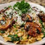 A creamy, comforting one-pan dish featuring orzo, mushrooms, and spinach, perfect for busy weeknights and packed with flavor.