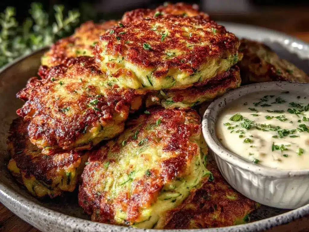 Crispy, golden zucchini fritters paired with a bright, tangy herb sauce, perfect as a snack, appetizer, or light meal. Quick and easy to make with simple ingredients.