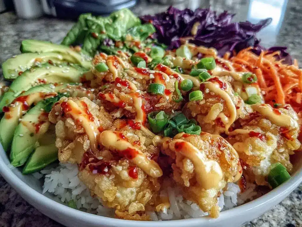 A quick and easy chicken bowl featuring crispy fried chicken, fresh veggies, and a creamy, spicy bang bang sauce. Perfect for busy weeknights and meal prep.