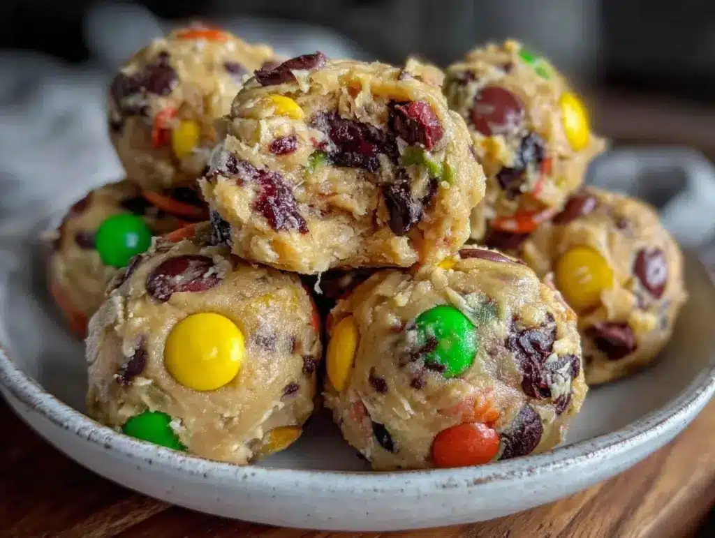 Chewy, sweet, and high-protein cookie dough bites packed with peanut butter, oats, and colorful M&M’s, perfect for a guilt-free snack or post-workout treat.