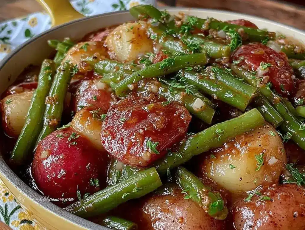 If potatoes seem undercooked, cover and steam a few minutes longer. For vegan/dairy-free, substitute butter with plant-based alternative and use vegetable broth. Avoid overcooking green beans to keep slight crispness. Adjust spice level by reducing red pepper flakes if sensitive.